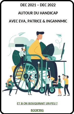 Récemment, je vous ai proposé de nous réunir autour des livres traitant la problématique du handicap ou dont le personnage (principal) est handicapé. Sachant, grâce à notre expérience avec les Feuilles allemandes et Le mois de l’Europe de l’Est, que c’est bien plus sympathique d’organiser les lectures thématiques à plusieurs, nous avons invité Ingrid du blog Book’ing à se joindre à notre équipe. Et elle a dit OUI ! Les choses se sont mises à bouger dès son arrivée. La liste de lecture a pris de l’ampleur, la petite semaine de décembre nous est devenue trop étroite. Nous avons donc décidé d’étaler les lectures sur toute l’année, de décembre 2021 à décembre 2022. Pour participer, il suffit de nous faire parvenir, à nous ou à Ingrid, le lien vers votre billet. Comme d’habitude, le logo créé par Ingrid est à votre disposition. Si vous préférez de la compagnie, nous vous proposons également quelques rendez-vous :